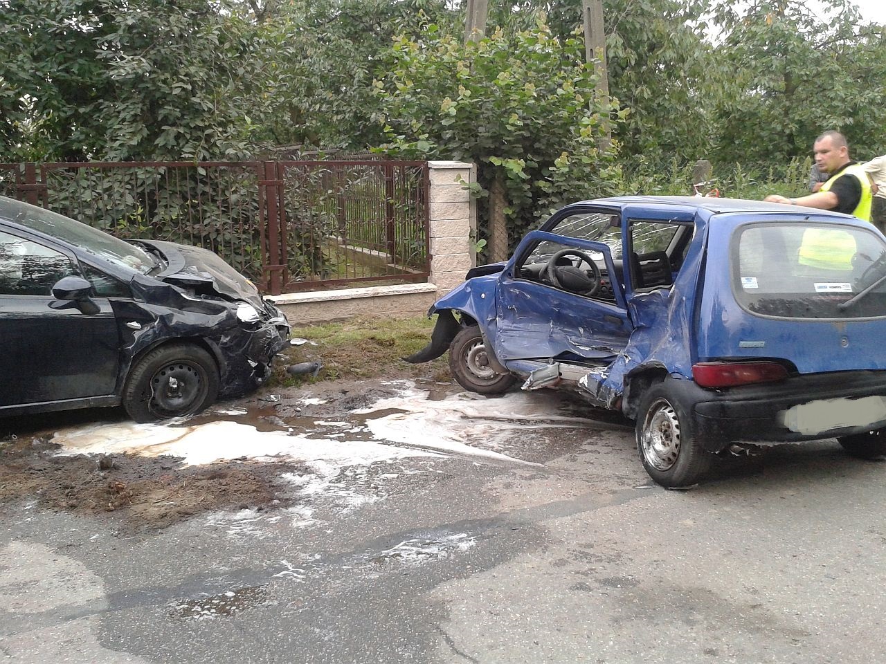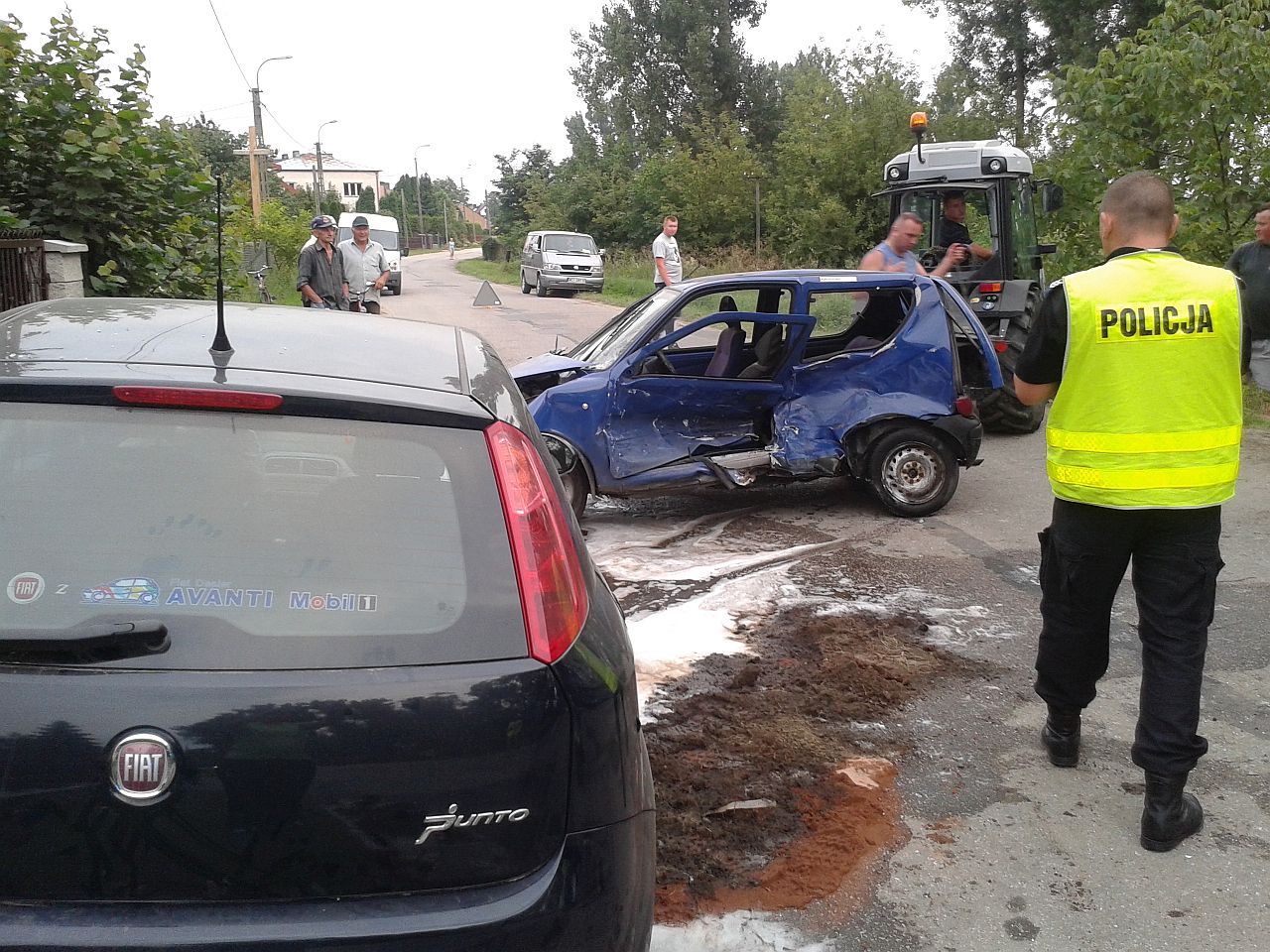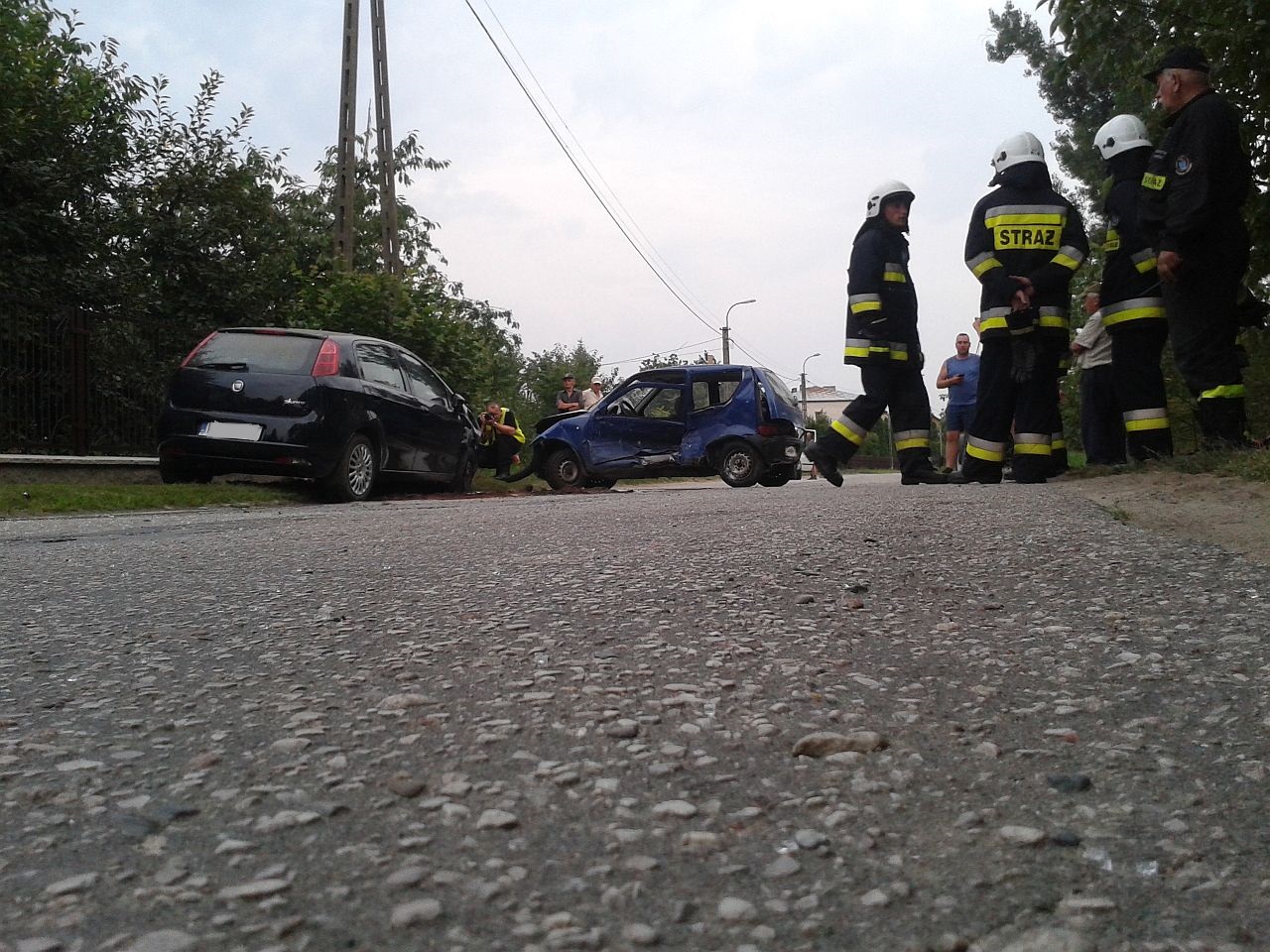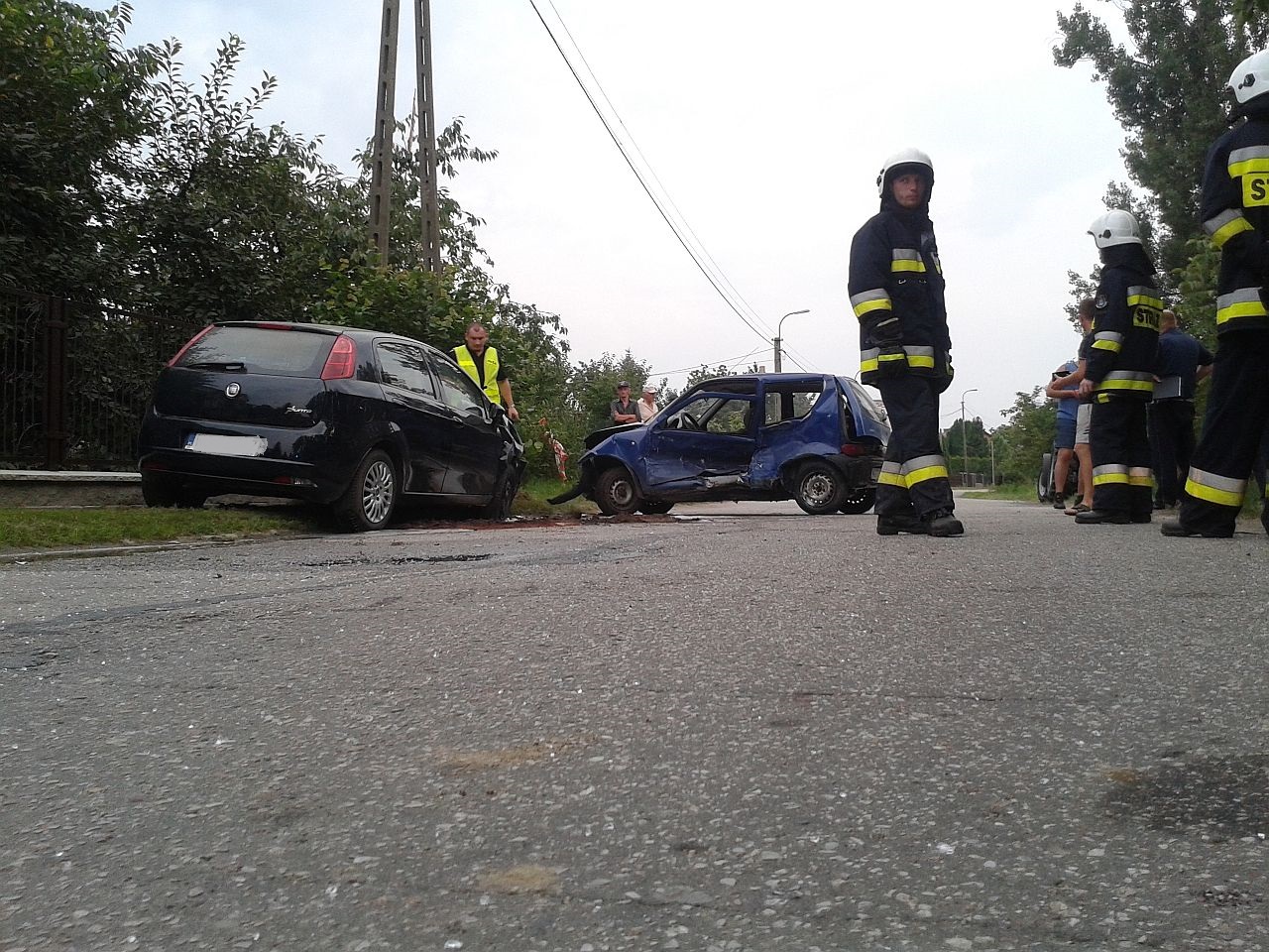 Z zeznań świadków wynikało, iż kierujący granatowym Fiatem Seicento wykonywał manewr skrętu na jedną z posesji. W tym samym czasie kierująca czarnym Fiatem Punto wykonała manewr wyprzedzania. Niestety w wyniku tego czarny pojazd uderzył w bok granatowego auta od strony kierowcy. Skutkiem tego było przesuniecie sie obu pojazdów o ok 50m i zatrzymanie na poboczu. Kierująca Fiatem Punto sama opuściła pojazd. Uskarżała sie na ból w klatce piersiowej, wywołany prawdopodobnie przez pasy oraz poduszkę powietrzną, która wystrzeliła w momencie uderzenia. Została zabrana przez pogotowie ratunkowe do szpitala . Kierujący Fiatem Seicento został wyjęty przez strażaków i przekazany pogotowiu ratunkowemu. Stwierdzono u niego podejrzenie uszkodzenia miednicy. Został przewieziony do szpitala.