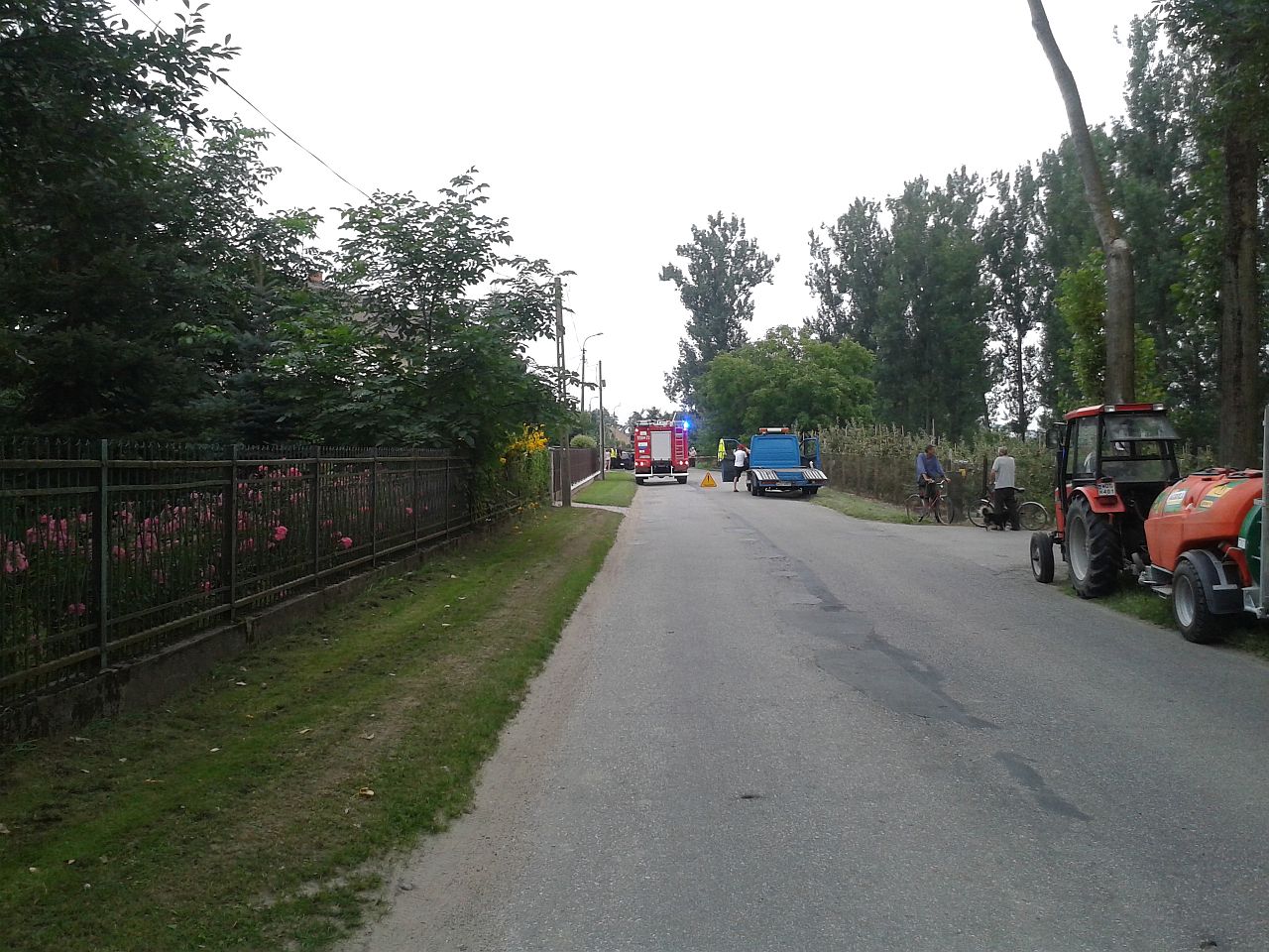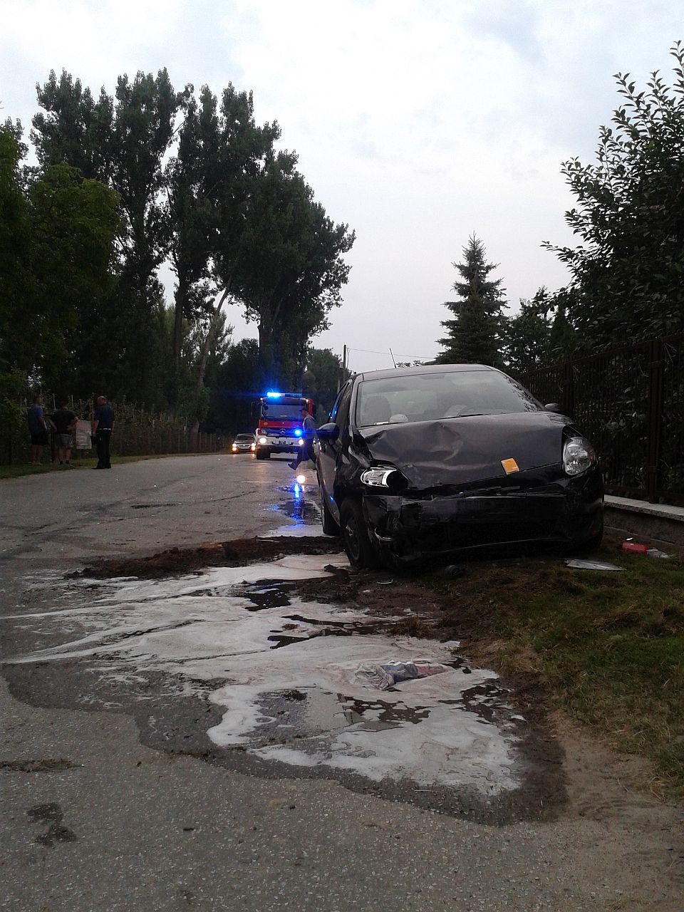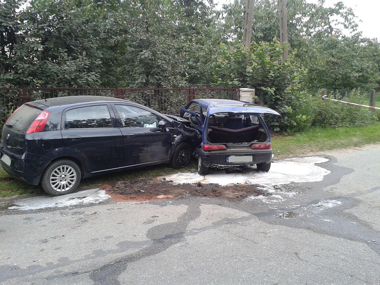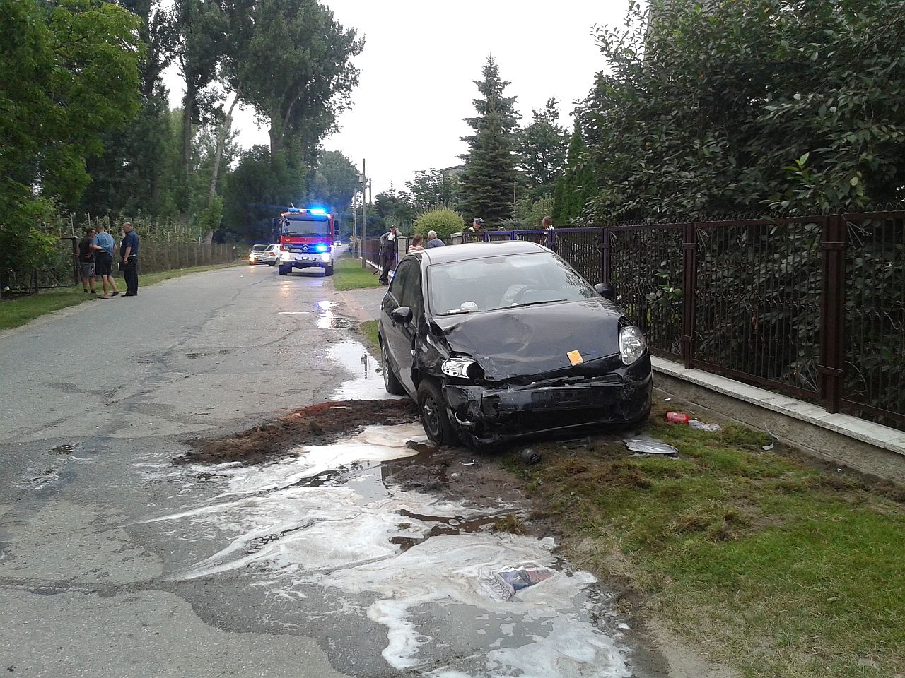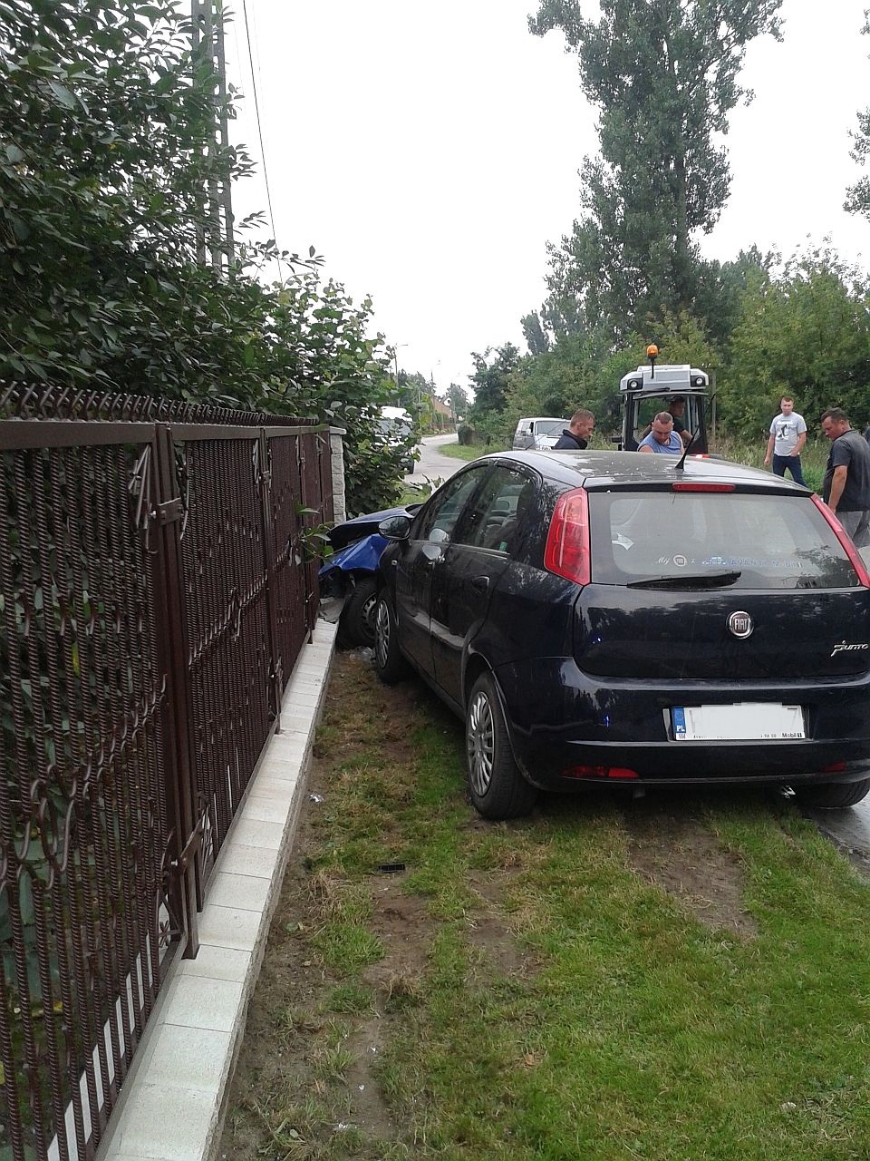 Z zeznań świadków wynikało, iż kierujący granatowym Fiatem Seicento wykonywał manewr skrętu na jedną z posesji. W tym samym czasie kierująca czarnym Fiatem Punto wykonała manewr wyprzedzania. Niestety w wyniku tego czarny pojazd uderzył w bok granatowego auta od strony kierowcy. Skutkiem tego było przesuniecie sie obu pojazdów o ok 50m i zatrzymanie na poboczu. Kierująca Fiatem Punto sama opuściła pojazd. Uskarżała sie na ból w klatce piersiowej, wywołany prawdopodobnie przez pasy oraz poduszkę powietrzną, która wystrzeliła w momencie uderzenia. Została zabrana przez pogotowie ratunkowe do szpitala . Kierujący Fiatem Seicento został wyjęty przez strażaków i przekazany pogotowiu ratunkowemu. Stwierdzono u niego podejrzenie uszkodzenia miednicy. Został przewieziony do szpitala.
