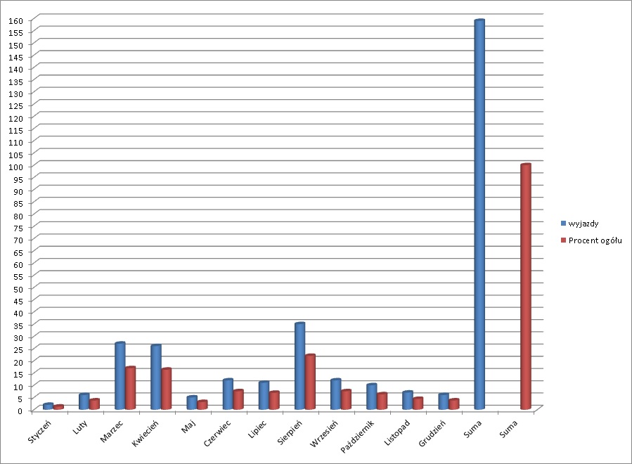 W stosunku do poprzedniego roku, ogolna ilość zdarzeń wzrosła o 30%. Pożarów mieliśmy wiecej o 37% a miejscowych zagrożeń o 10%.